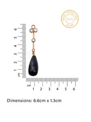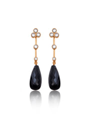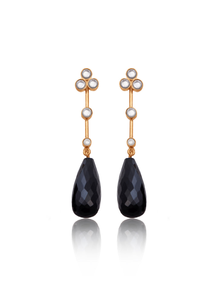 Introducing the stunning Onyx Briolette Drop Kundan Delights - the must-have accessory for any fashion-forward woman. Made with 925 Sterling Silver and 22K Gold Plating, these earrings feature a gorgeous Black Onyx Faceted Briolette Drop that elegantly hangs at the bottom, complemented by Round Kundan for a touch of sparkle. These earrings are the perfect statement piece for any occasion, whether it's a night out or a special event.