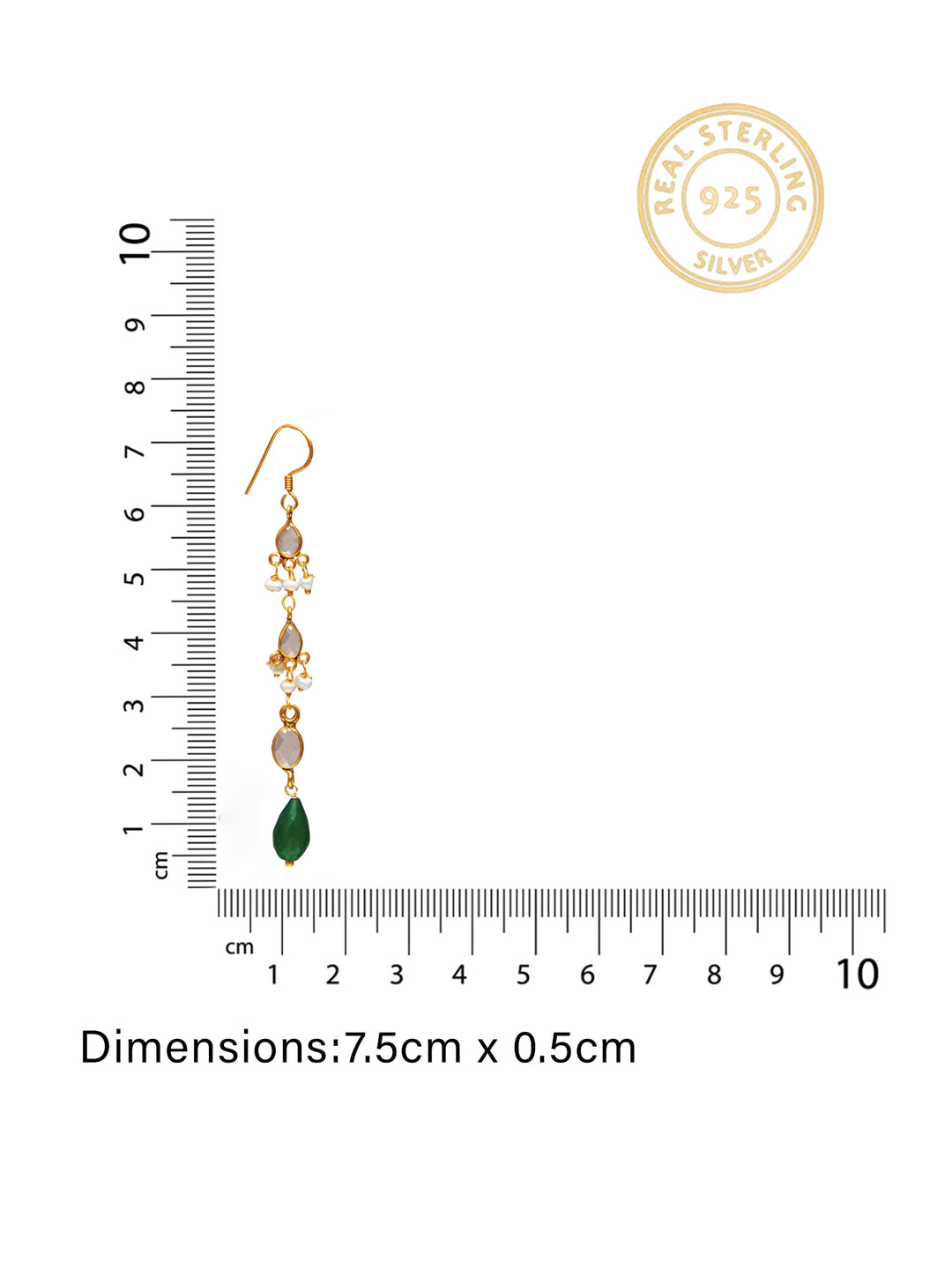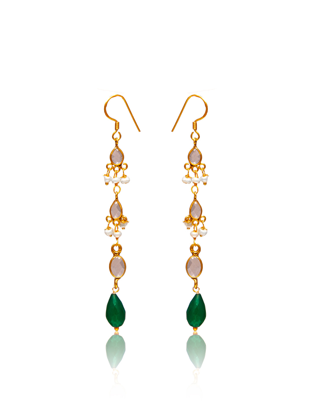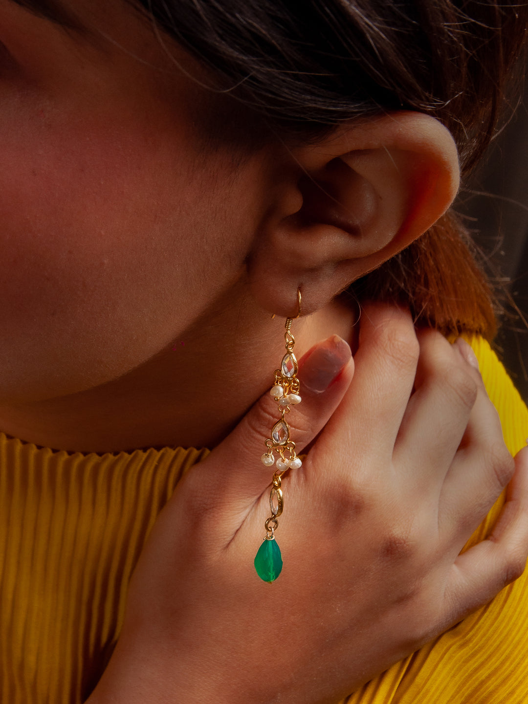 The focal point of these earrings is the arrangement of three pear-shaped checker crystals, delicately cascading below each other. Each crystal is adorned with a lustrous pearl drop, adding a touch of sophistication. To complete the design, a green onyx drop hangs below the dangler earring, adding a pop of vibrant color.
