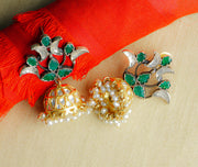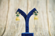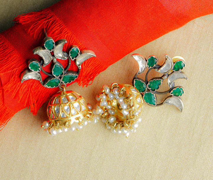 925 Silver Gold Plated Green Stone Earrings with Kundan Jhumki