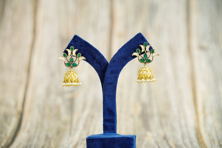 Show your style and sophistication in these exquisite designer earrings. The fresh emerald stone is set in a gleaming silver setting. This piece of jewelry is perfect for the fashion forward lady who wants to wow the crowds with her unique style. Whether you're a "traditional" or "modern" woman, our 925 Silver Gold Plated Green Stone Earrings with Kundan Jhumki are the perfect accessory for your everyday wear. We hand-make these earrings in-house and design them with a unique, handcrafted touch that is sure to impress your friends and coworkers.