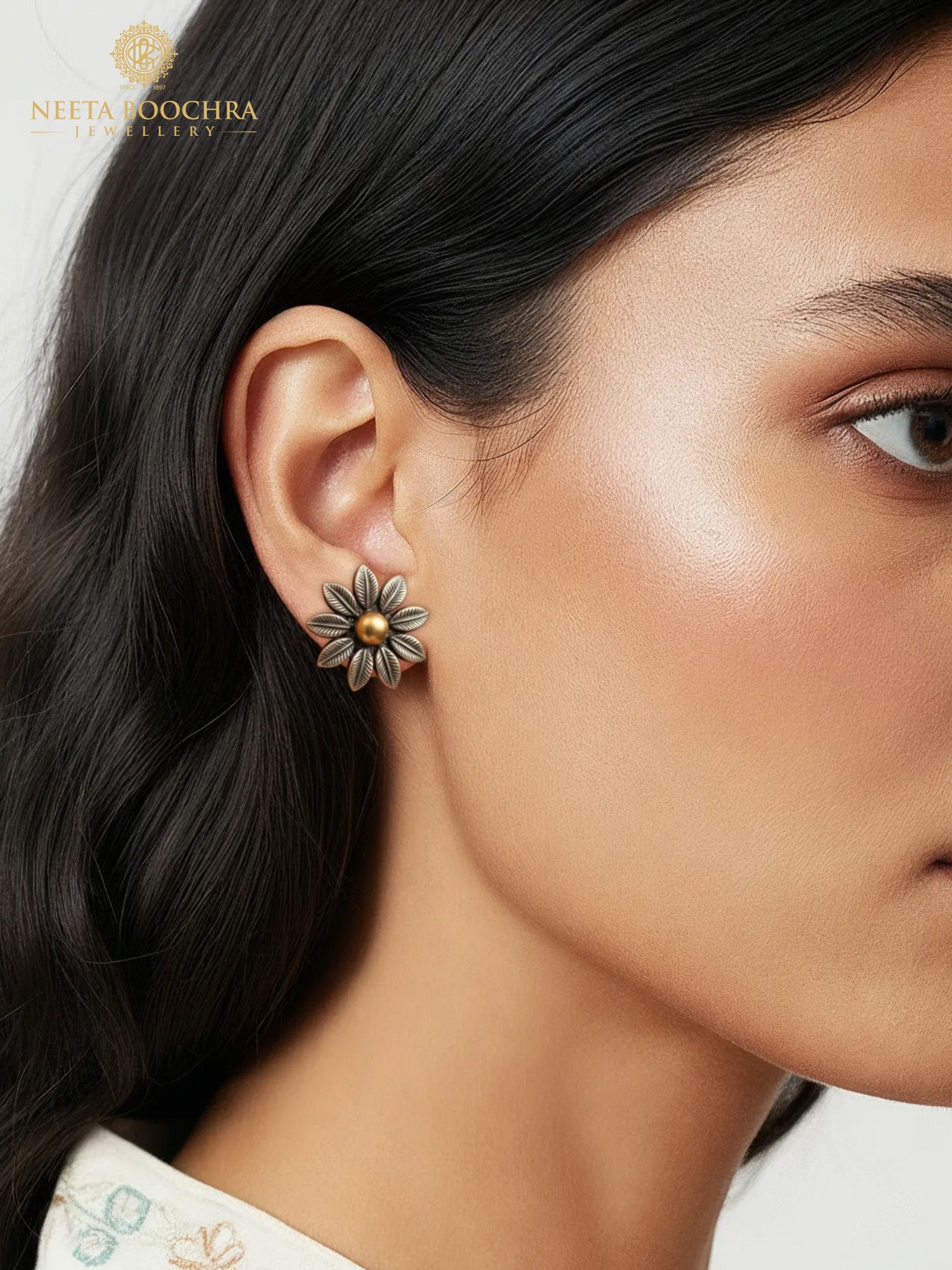 Make an elegant statement with the Nitya 925 Silver Two Tone Flower Earrings. • Crafted from high-quality 925 sterling silver • Captivating flower petal design • Shimmering two-tone plating • Protected by anti-tarnish coating for lasting shine These earrings are the epitome of refined sophistication. The delicate floral motif and gleaming two-tone finish create an eye-catching look that's perfect for any occasion. Whether you're dressing up for a night out or simply want to add a polished touch to your everyday style, the Nitya earrings will elevate your look with effortless charm.