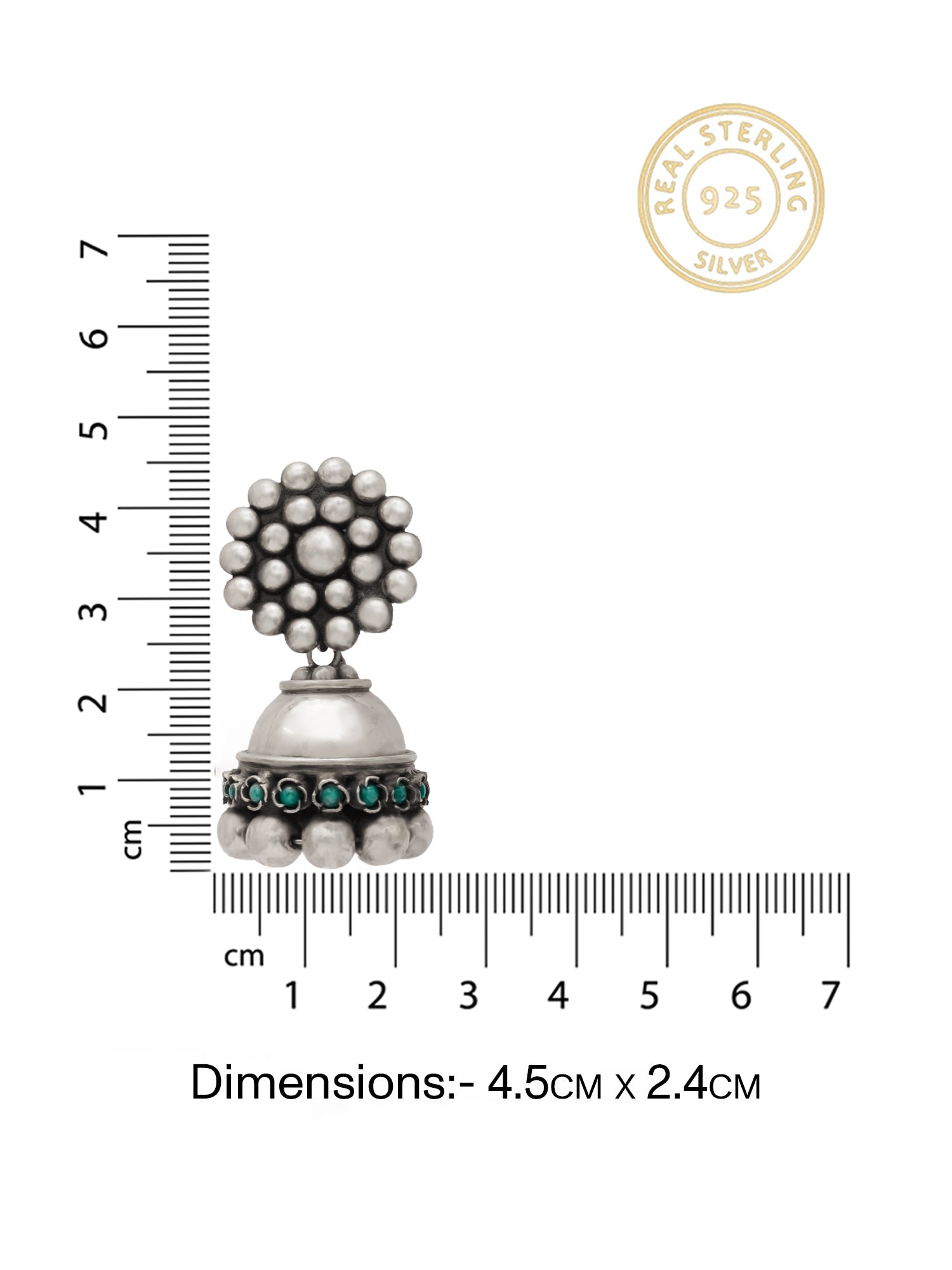 The earrings feature a round top with delicate dotted detailing, showcasing expert silver craftsmanship. The jhumki is adorned with vibrant turquoise gemstones all around the sides, adding a colorful, regal touch. Made from 925 sterling silver with an anti-tarnish coating, these earrings retain their shine and beauty for years to come.