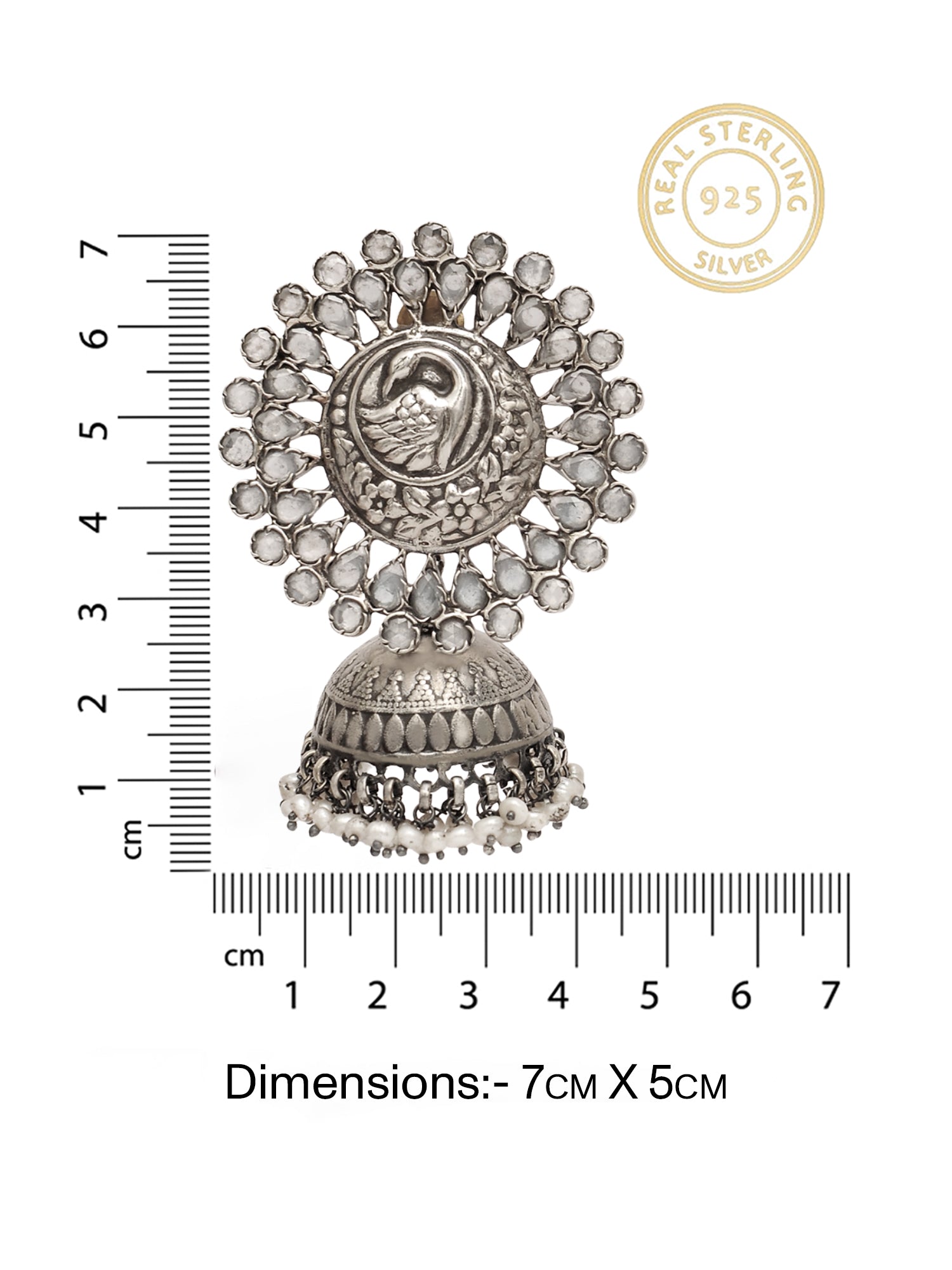 Rajwada 925 Silver Statement Peacock Motif Jhumkis with Crystal and Pearl